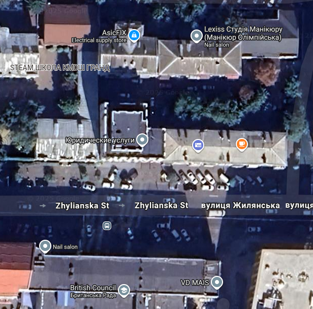 (b5) Google Maps; British Council, EU-Vertretung, UKRSPECSYSTEMS; https://www.google.com/maps/place/Zhylianska+St,+Kyiv,+Ukraine,+02000/@50.4338522,30.5096325,18z/data=!4m6!3m5!1s0x40d4cef10badc3c3:0x5159fed7a76d80b2!8m2!3d50.4396641!4d30.498437!16s%2Fg%2F120xv69v?entry=ttu&g_ep=EgoyMDI1MDgyNS4wIKXMDSoASAFQAw%3D%3D; Bildschirmfoto; abgerufen: 02.09.2025